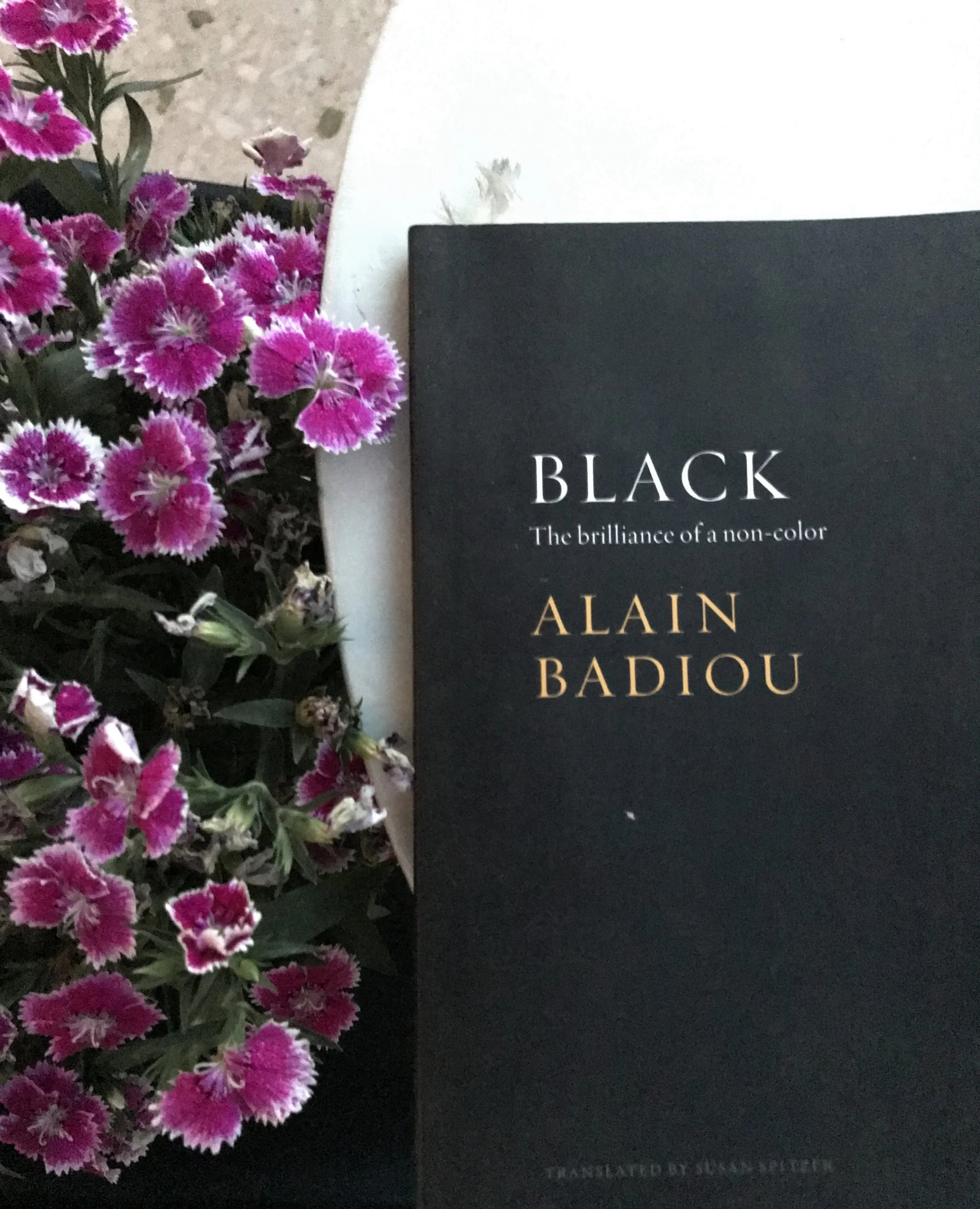 “Our rainbow, that miraculous arch connecting rain and sun, sets out its shimmering, sparkling palette, from red to violet. . . . What is missing from both snow and night is the rainbow.” Alain Badiou’s book Black: The Brilliance of a Non Color next to purple flowers.